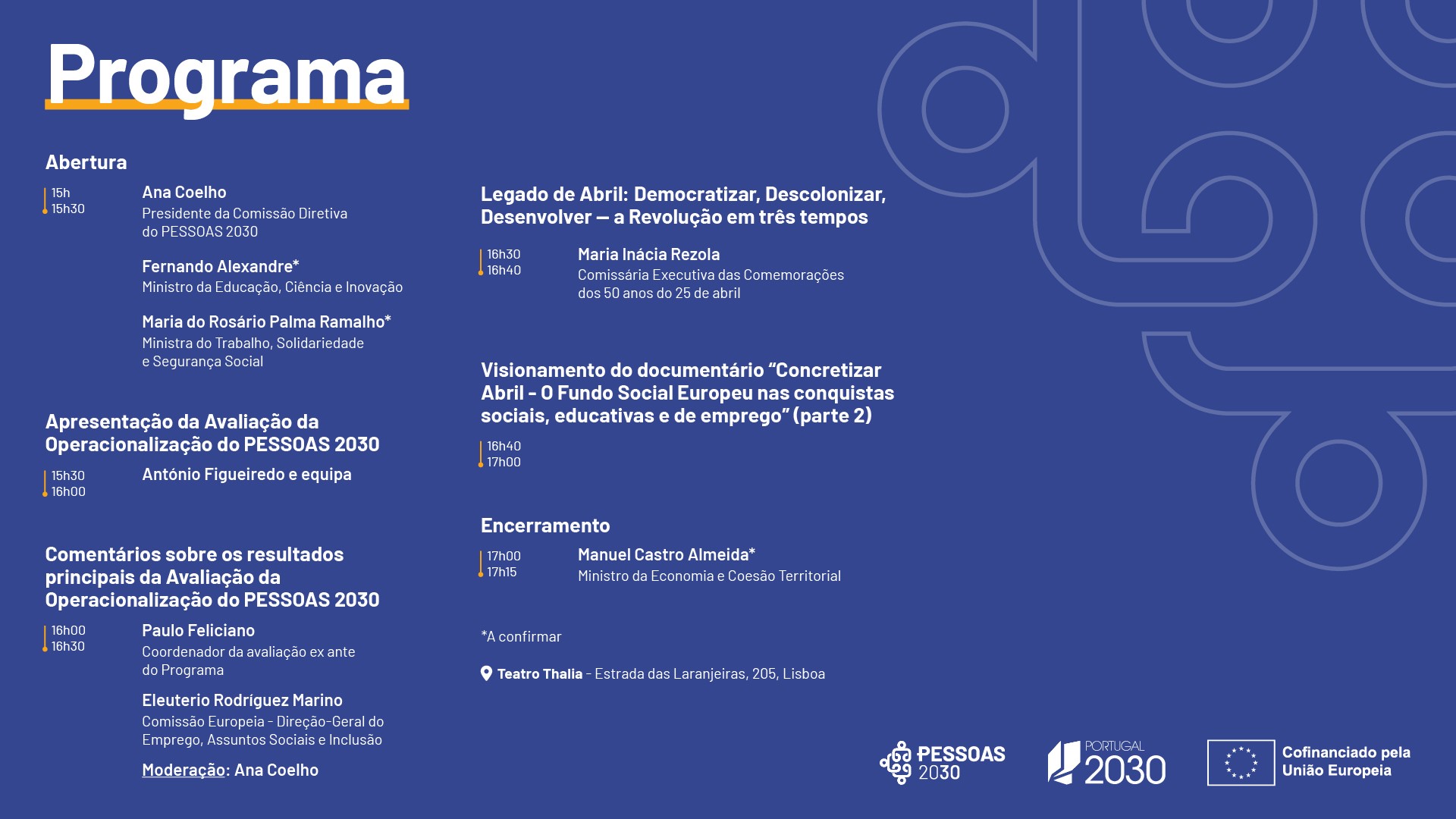 A Comissão Diretiva do PESSOAS 2030 convida a assistir ao evento de Apresentação da Avaliação da Operacionalização do PESSOAS 2030 e da estreia da Segunda parte do Documentário “Concretizar Abril – O Fundo Social Europeu nas conquistas sociais, educativas e de emprego”, que terá lugar no dia 30 de junho de 2025, a partir das 15 horas, no Teatro Thalia, em Lisboa, de acordo com o programa provisório.